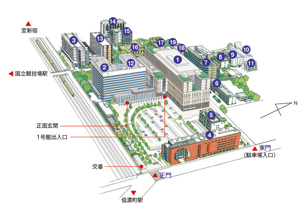 【3】3号館(南棟)(病院)【4】信濃町煉瓦館 【5】孝養舎 【6】東校舎【7】総合医科学研究棟【8】第2校舎